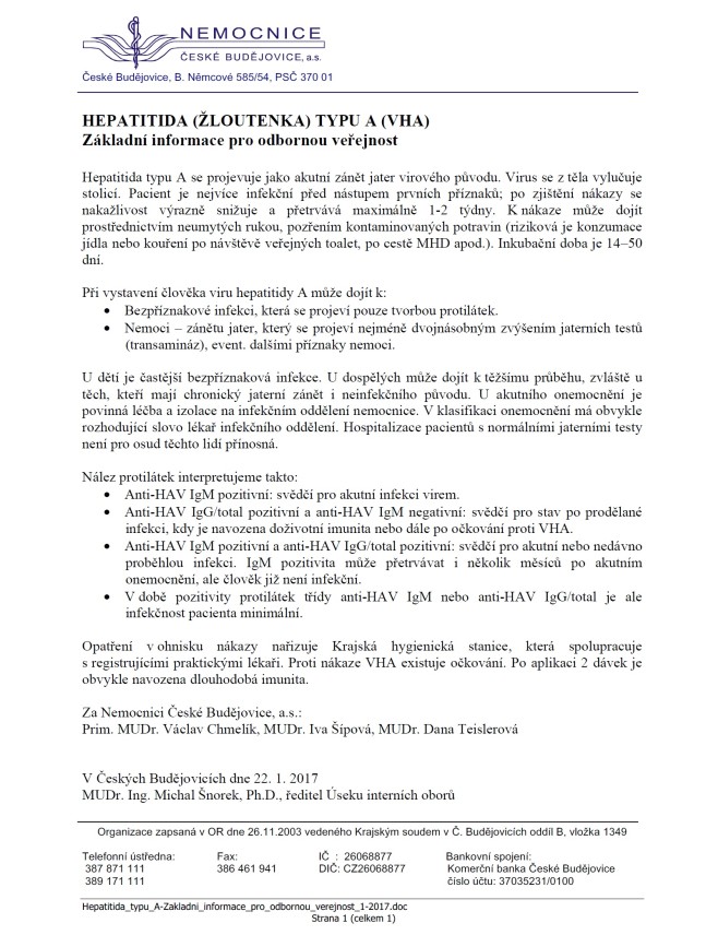 Nemocnice České Budějovice, a.s. zveřejňuje své odborné stanovisko k problematice hepatitidy typu A. Základní informace je určena pro odbornou veřejnost, především ambulantní poskytovatele zdravotních služeb: