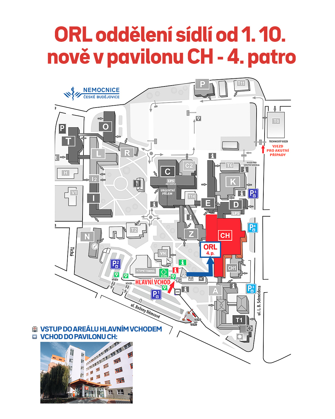 V týdnu od 29. 9. do 3. 10. 2025 bude probíhat stěhování ORL oddělení z dolního areálu do pavilonu CH v horním areálu. Po tuto dobu bude provoz probíhat v omezeném režimu.